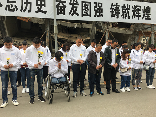 当日,降温的北川只有12℃左右。上午10点,师生们穿着印有“北川中学2010级7班”字样的白色卫衣,来到北川老县城地震遗址,为在地震中遇难的同胞默哀;随后,他们来到北川中学遗址,为在地震中遇难的教师和学生三鞠躬、默哀并献花。