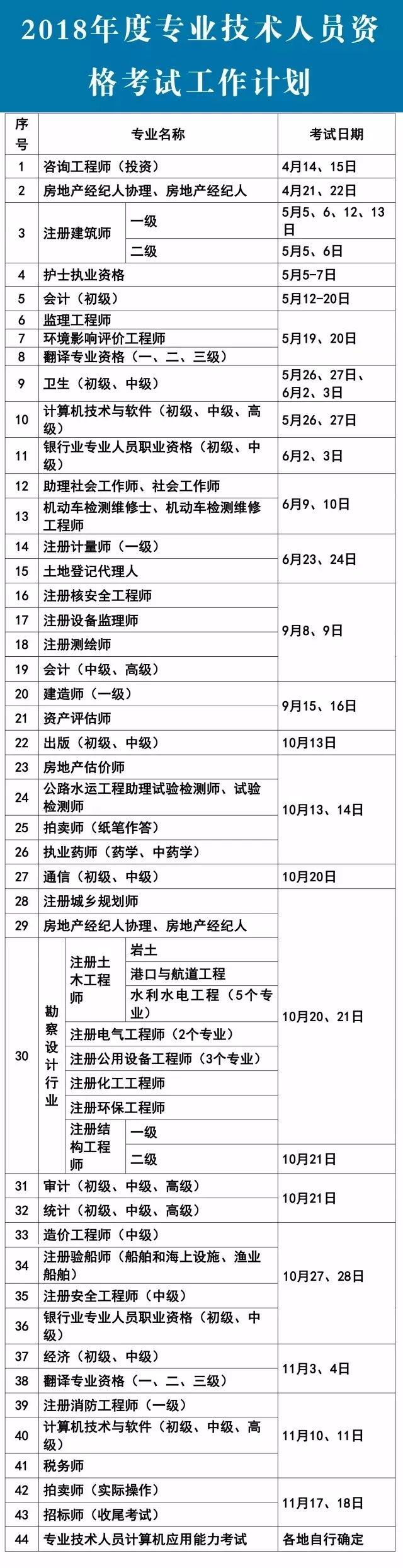 人社部办公厅曾印发《关于2018年度专业技术人员资格考试计划及有关问题的通知》,公布2018年度专业技术人员资格考试工作计划,并对有关问题做出安排。