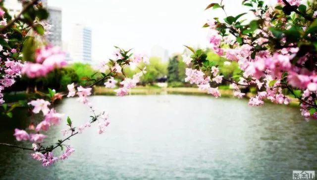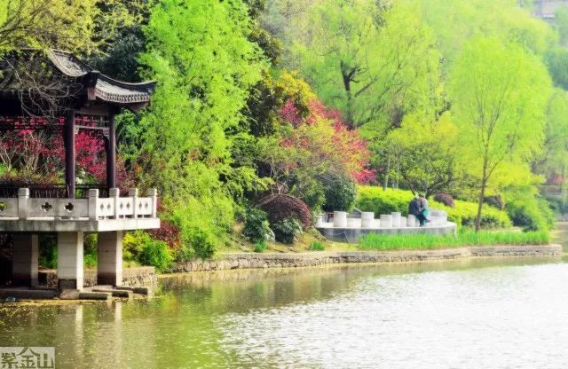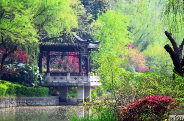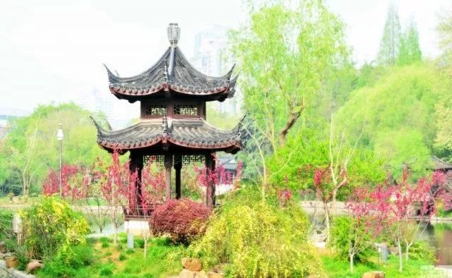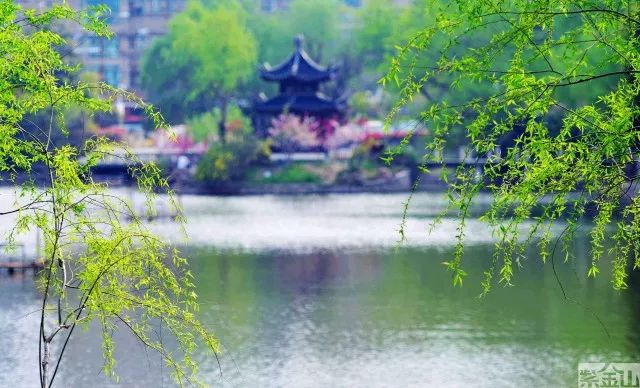 立于宛在亭内,遥望北面的紫菱洲,一片绿纱烟笼;潭东岸的龙游亭、藕香榭等倒影水面;游人则在小径的绿柳红花下穿行……