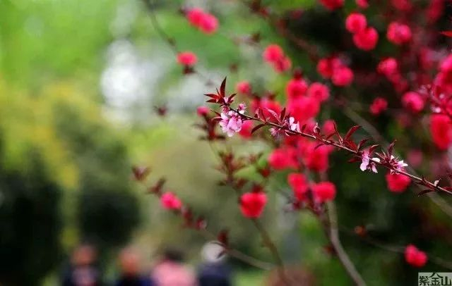 亭子有水上曲桥与岸边相通,四周则广布花木,这个时节正值春花绽放,红的、黄的、粉的,潭边的游人很容易被鲜花高亭所吸引,不时来到亭下拍照、赏景。