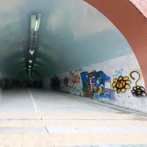 走进隧道的第一面墙上,“请勿签画,尊重创作”的提醒十分显眼。但是游客们的随意涂鸦甚至比学生的画作更为抢眼。