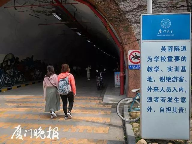 随后有记者探访厦大芙蓉隧道,在靠近芙蓉餐厅的隧道入口处立着一块提示牌,上面写着“芙蓉隧道为学校重要教学、实训基地,谢绝游客、外来人员入内。”但在开放时间,还是有不少游客在隧道里拍照。