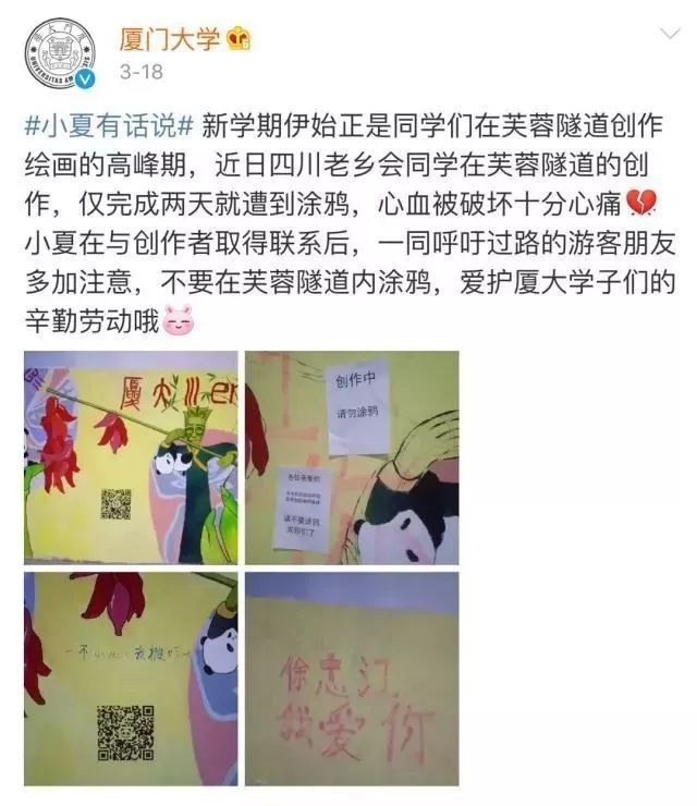 然而,近日,有网友发帖称,厦门大学的芙蓉隧道被游客涂成“牛皮癣”,学生贴纸条“求放过”。早在3月18日,厦门大学官方微博也发布了一条微博呼吁,不要在芙蓉隧道内涂鸦,爱护学子们的辛勤劳动。