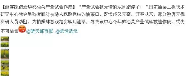 2016年,华中农业大学的农业试验区,遭进入学校参观的游客损毁。据报道,保安曾制止过这些游客,但被直接无视,之后该游客更是一屁股就坐了上去……