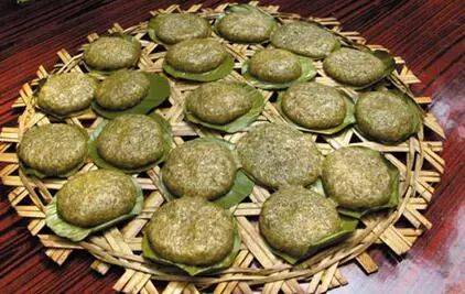 客家人有句老话,叫“清明前后吃艾粄,一年四季不生病”。艾粄是清明节客家人必备的传统小食。首先是将采摘回来的鲜嫩艾草洗净,放锅中煮熟后捞起,沥干水份,煮艾草的水要保留备用。然后将煮熟的艾草剁成草泥,草泥剁得越细越烂越好。艾草泥剁好后,用煮艾草的水,加上糯米粉一齐和拌成团。然后把准备好的芝麻、眉豆、花生等馅料包进面团里,再封口捏成圆形、长形等形状,放入锅中隔水蒸15-20分钟后即可出炉。