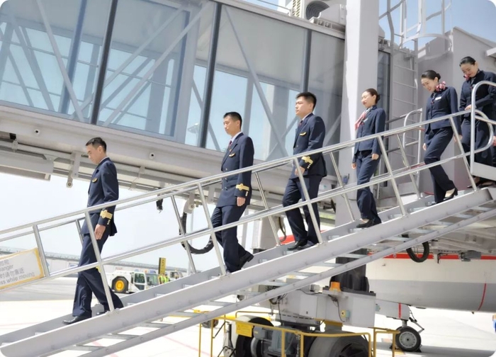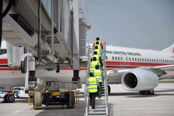 ▲中国联合航空机组人员走下飞机。