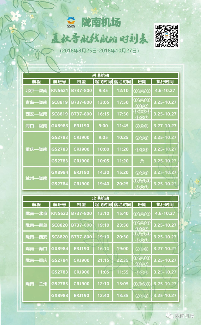 附:陇南机场2018年夏秋季航班时刻表