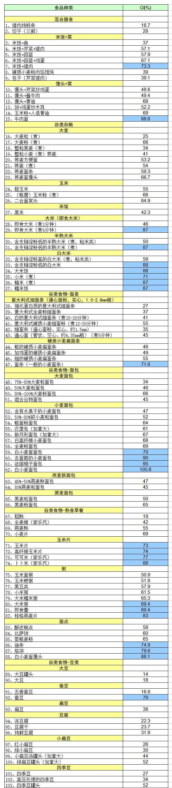 常见食物血糖(GI)生成指数表↓