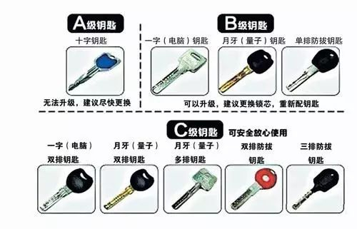 先普及一个常识,家庭用锁根据安全等级划分,大致有3个种类,A级锁、B级锁和C级锁。A级锁的锁芯最原始,钥匙通常是十字钥匙,或是单面单排弹子槽,安全性最差;而C级锁的钥匙,一般为双排、电脑、复合曲线槽,既防锡纸、又防暴力,安全性相对较高。