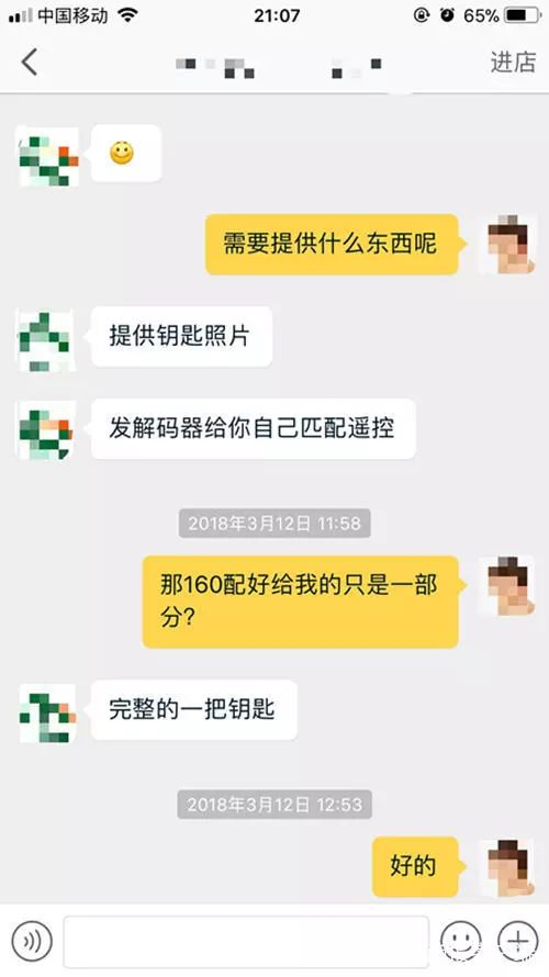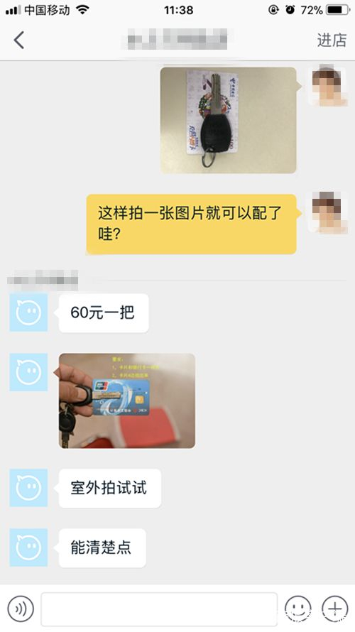 随后,记者以买家的身份联系了商家,客服表示只需要将钥匙放在一张和银行卡一样大小的卡片上,卡片四边拍出来即可,第二天就能发货。