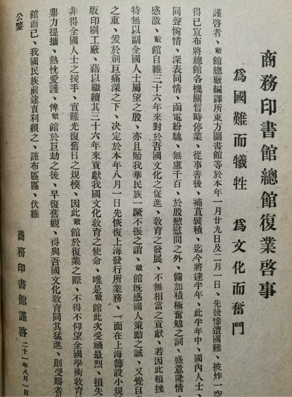 1932年8月1日,商务印书馆的总管理处、上海发行所和在租界内新设的印刷厂同时恢复营业。在这个来之不易的日子,王云五提出的复业标语“为国难而牺牲,为文化而奋斗”被制成大字悬挂于发行所门口,令在场的员工和顾客百感交集。