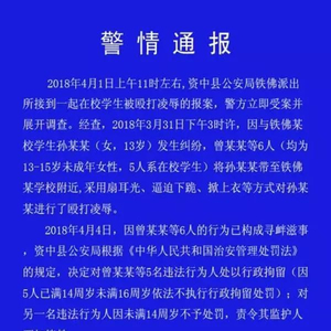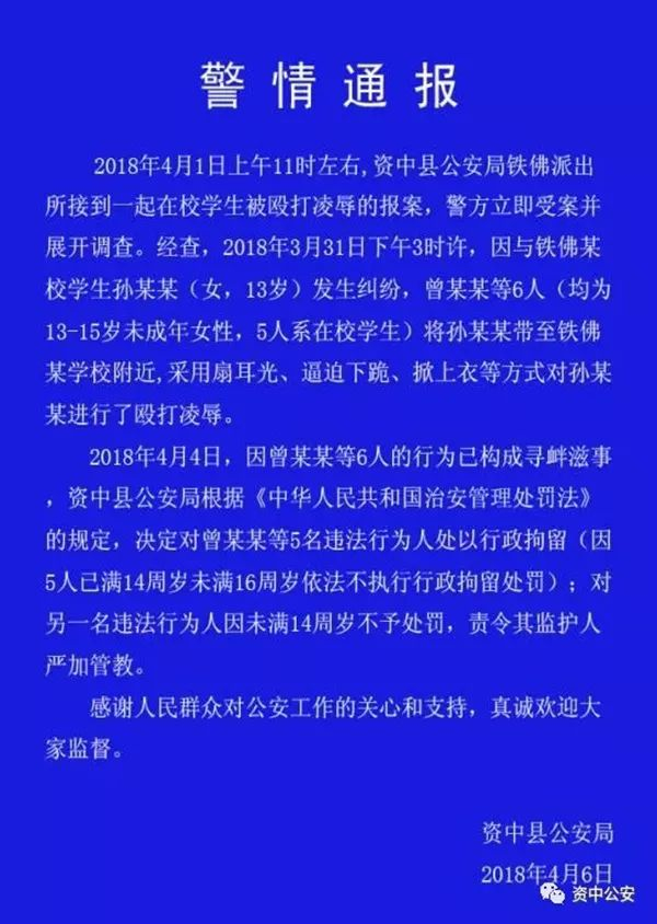 2018年4月1日上午11时左右,四川资中县公安局铁佛派出所接到一起在校学生被殴打凌辱的报案,警方立即受案并展开调查。经查,2018年3月31日下午3时许,因与铁佛某校学生孙某某(女,13岁)发生纠纷,曾某某等6人(均为13-15岁未成年女性,5人系在校学生)将孙某某带至铁佛某学校附近,采用扇耳光、逼迫下跪、掀上衣等方式对孙某某进行了殴打凌辱。2018年4月4日,因曾某某等6人的行为已构成寻衅滋事,资中县公安局根据《中华人民共和国治安管理处罚法》的规定,决定对曾某某等5名违法行为人处以行政拘留(因5人已满14周岁未满16周岁依法不执行行政拘留处罚);对另一名违法行为人因未满14周岁不予处罚,责令其监护人严加管教。