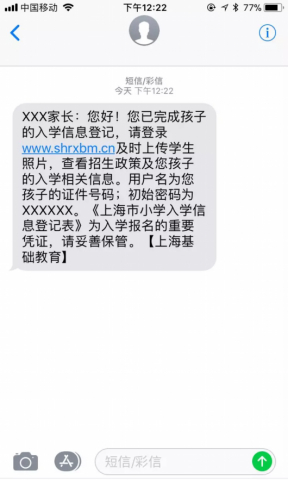 完成入学信息登记后,家长可通过手机获取“上海基础教育”发出的短信:例如“XXX家长:您好!您已完成孩子的入学信息登记,请登录www.shrxbm.cn及时上传学生照片,查看招生政策及您孩子的入学相关信息。用户名为您孩子的证件号码;初始密码为XXXXXX。《上海市小学入学信息登记表》为入学报名的重要凭证,请妥善保管。[上海基础教育]”
