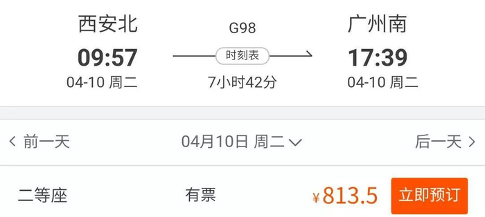 西安至广州最快动车二等座车票价格为813.5元