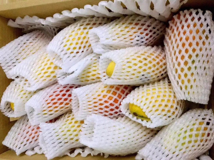 采摘下来的芒果在果地会做第一道分拣,一些有虫眼或者品相不佳的果子在这个时间就会被淘汰掉,并且为了避免路上被磕碰,会在进行简单的套袋或打包后,再送往专门的打包车间进行正式打包。