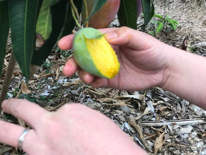 树上熟贵妃芒从尖头位置已经开始转黄色