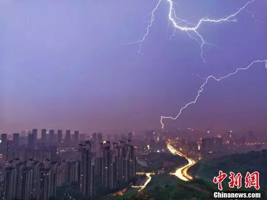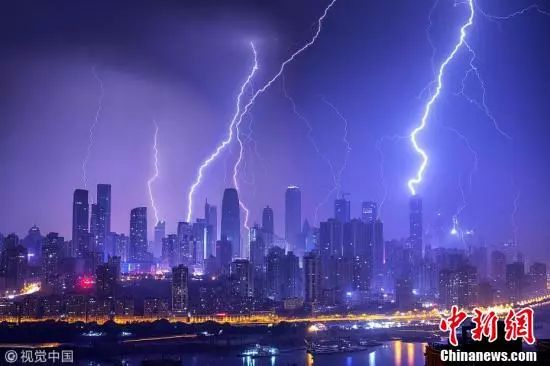 4月5日凌晨,重庆雷雨交加陡降温,一道道闪电划过,照亮了城市夜空。