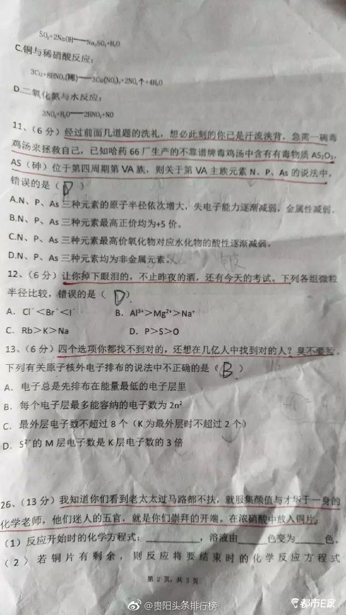 “又是别人家的化学老师,为什么我从来没遇到过?”正在贵阳某中学读高三的张莉(化名)为这样的试卷反复打CALL。她告诉贵州都市报记者,同样是月考,自己的老师总是板着一副面孔,试卷也是千篇一律,学习真的感觉很无趣。