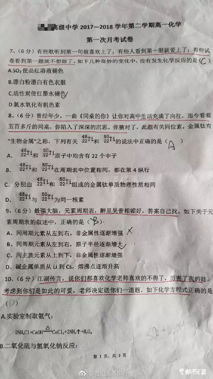 日前,遵义市湄潭县湄江高级中学高一年级一份“新潮”的化学月考试卷被网友转发。试卷中,每道题目的前面都有一段几十个字的“引题”,或流行时尚,或搞笑调侃,或聚焦热点,然后才是正题。这份试卷很快引发了大家的广泛关注。