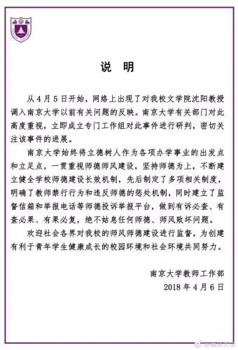 2、根据两校的《声明》,沈阳目前处于等待核查和调查的阶段。在此阶段,停止沈阳从事南京大学文学院的教书育人工作。