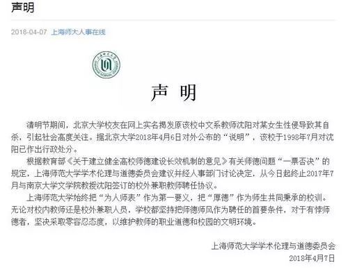 7日,上海师范大学人事处官方微信发布声明,称从7日起终止2017年7月与南京大学文学院教授沈阳签订的校外兼职教师聘任协议。