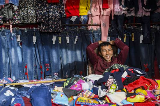 适逢周末,地处新疆库车县牙哈镇的乡村巴扎(意为集市、农贸市场)再次热闹起来,“两横一纵”总长超过一公里的乡道上人群熙熙攘攘,服装、饮食、果蔬、手工艺品、农具等各色商品琳琅满目。这是在乡村巴扎上,一位服装商贩在摊位上等待顾客。