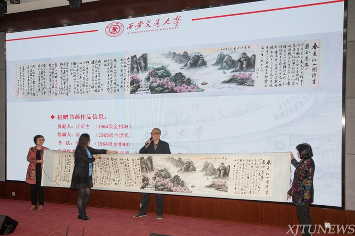 1964级金相43班汪荷生等10位校友向学校捐赠了专门创作的诗画长卷。