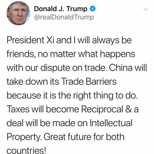 这条最新推特与特朗普之前推特在语气上有变化,对习主席和中国都表达了尊重。与此同时,他对中美贸易战的态度是含混的。他一边表达了对中国单方面“取消贸易壁垒”的期待,一边表示双方“将会在知识产权上达成协议”,似有主张双方各让一步的意思。