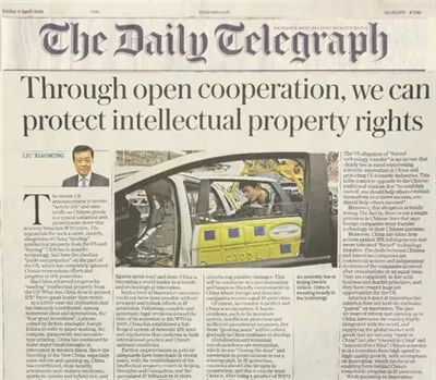 4月6日,英国发行量最大的主流大报《每日电讯报》刊登驻英国大使刘晓明题为《坚持开放合作,保护知识产权》的署名文章,批驳美国诬蔑中国“窃取”知识产权。