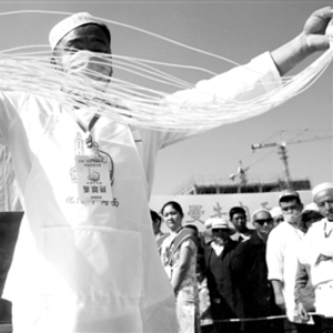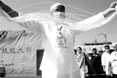 4月7日,青海省化隆回族自治县举行拉面技能大赛。图为拉面师傅现场拉面。