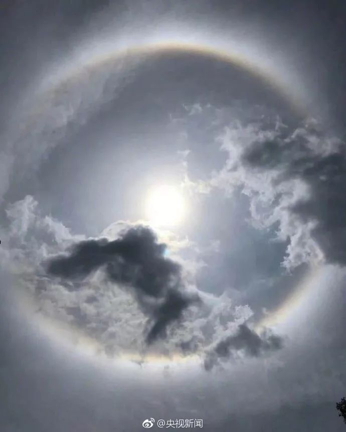 9日,云南昆明上空出现日晕奇观,巨大的彩色光环围绕着太阳,绚丽无比。日晕是一种大气光学现象,日光通过卷层云时,受到冰晶的折射或反射而形成的。