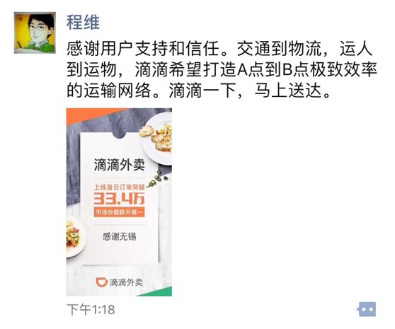 今日,滴滴出行CEO程维也发布朋友圈称,感谢用户支持和信任。交通到物流,运人到运物,滴滴望打造A点到B点极致效率的运输网络。