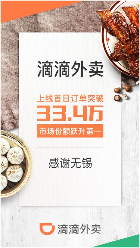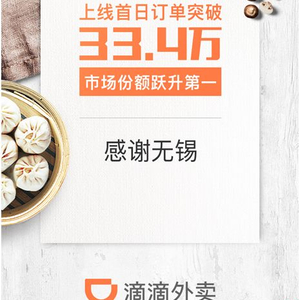 经过8天的试运营,滴滴外卖昨天(4月9日)正式在无锡全城范围内上线,当日订单33.4万单。这意味着滴滴外卖在短短9天内已成为无锡市场份额第一的外卖平台,超过滴滴外卖此前的预期。