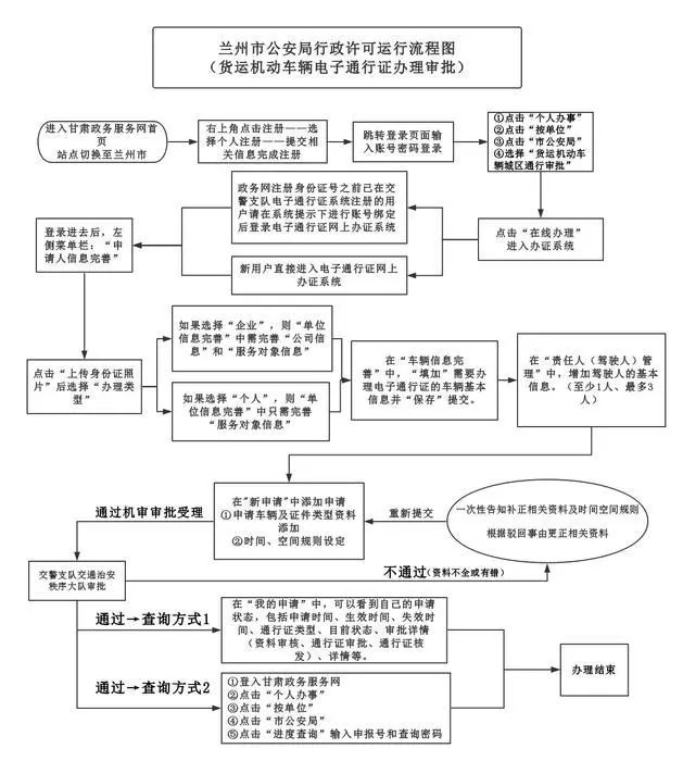 目前,经过兰州市政府政务服务中心、市大数据局、市公安局交警支队协调相关单位,完成了系统研发、接口对接、网络联通等工作,已进入系统联调测试阶段。从2018年4月16日起,车主办理货运机动车辆电子通行证须从原“兰州市公安局交通警察支队”官网登陆更改至“甘肃政务服务网(http://www.gszwfw.gov.cn/)”登录。广大车主需仔细阅读网站公布的办理流程和服务指南。具体办证步骤无变化。此外,已在交警支队电子通行证系统注册过的用户请在系统提示下进行账号绑定;新用户直接进入办证系统。