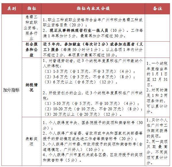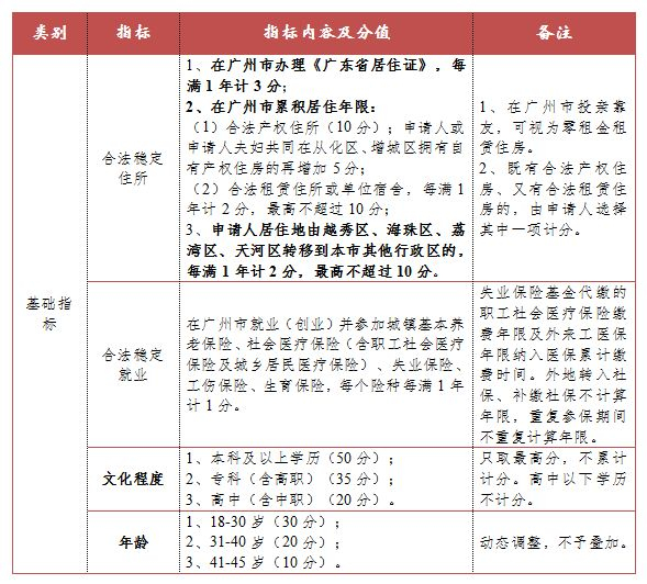 《广州市来穗人员积分制服务管理规定实施细则(试行)》共18条,核心内容是指标体系和分值表。积分指标体系由基础指标、加分指标和减分指标3类12项组成。
