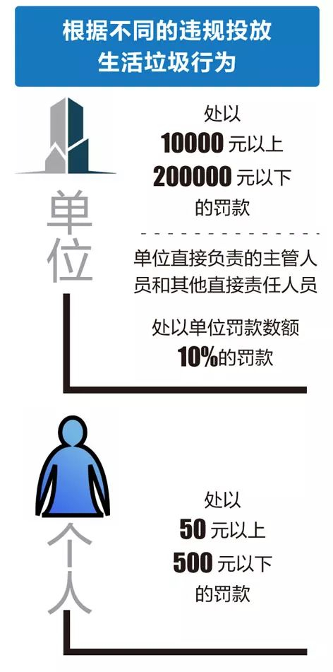 根据不同的违规投放生活垃圾行为,对单位处以最高20万的罚款,同时对单位直接负责的主管人员和其他直接责任人员处以单位罚款数额10%的罚款。对个人违反相关投放规定的,将处以50元以上500元以下罚款。