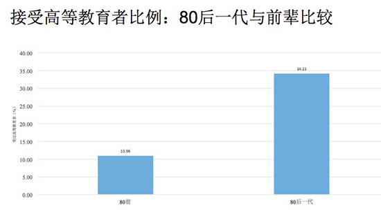 在世界高等教育扩招的大潮流里,看我们中国高等教育扩展的情况。自1977年恢复高考后,中国的高等教育发展也很快,尤其是1999年高校开始扩招。从下图可以看出,在扩招之前大学生招收人数每年比较平稳,增幅较小,扩招后大学生增长得非常明显。根据中国人民大学和香港科技大学2013年中国全国社会调查数据,在接受高等教育的比例上,1980年之前出生的人受高等教育是10%左右,到80后这一代就达到了34%,80后受教育程度是其前辈的三倍。高校的扩招,一定程度上意味着知识社会的到来,因为知识资本的可流动性,给许多人的自由流动提供了条件。