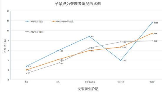 三个年龄群体中,子辈成为管理者阶层的比例——1965年前出生的人,农民子辈成为管理者阶层的比例约为2.74%,工人阶级的相比较高一些,5.88%,一般非体力劳动者的更高,8.81%,但专业技术人员的比例突然下降了,3.92%。这里可能和中国当时的社会运动有关系。管理者子辈成为管理者阶层的比例最高,11.62%。1965年到1980年出生的这个群体中,子辈成为管理者阶层的比例随着父辈职业阶层的提高而提高,平缓地上升。在80后出生的人这个群体中,增长也比较平缓,管理者的子辈成为管理者的比例还是最高(7.89%),但专业技术者的子辈成为管理者的比例已经逼近(7.69%)。
