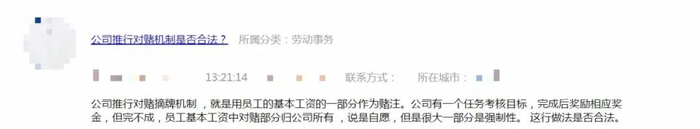 公司推行对赌摘牌机制 ,用员工的基本工资的一部分作为赌注。公司设定任务考核目标,如果员工完成任务,公司就奖励员工相应奖金,但如果员工无法完成任务,那么员工基本工资中对赌部分就归公司所有 ,说是自愿,但实际上具有强制性。 请问这种做法合法吗?