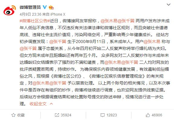 为确保娱乐内容领域健康发展,有效遏制低俗媚俗之风,现根据《微博社区公约》、《微博社区娱乐信息管理规定》的有关规定,对@张木易@张千巽 予以禁言处理。 以上两个账号的相关情况,以及本次事件中是否存在有组织的炒作,微博将继续进行调查,也欢迎网友提供线索证据。 后续站方会根据调查结果和被处置账号提交的陈述申辩,视情况进行进一步处理。