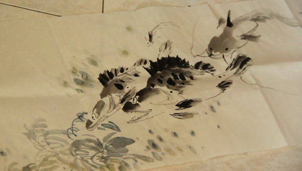 李文彬的友人送给他的国画作品中的鳜鱼与鲶鱼。