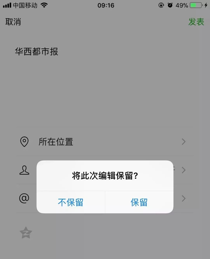 更新后,在编辑朋友圈中途退出时,会弹出一个提示框,可以选择是否保留此次编辑。