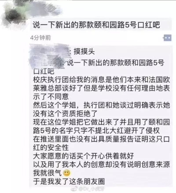 除了产品质量问题外,王梓在文中将“颐和园5号”与北大校庆挂钩,事实上,它并未得到北大官方的授权,因此王梓也耍了个小聪明——口红名称不含“北大”字样,却和北大的地址“颐和园路5号”相似,让不少人误以为,这款口红是北大校庆官方出品。