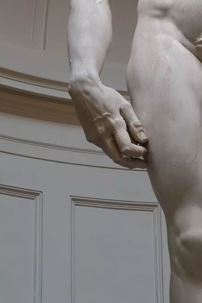 可是这一次,我感觉它的气势并不是来自巨大的体量,而是一种无比强大的生命的力量——当然是人身上的那种力量。这力量在雕像身体的每个地方。他的胸肌、腹部、后背、双肩、双腿、手脚、嘴角、鼻翼,直到炯炯逼人的目光。可这生命的力量是通过冷冰冰坚硬的石头散发出来的,石头里是没有人的生命力的,他用什么办法把这种生命力注入到石头里边的?即使他真的有什么神奇的能力把人的生命力注入到石头里,可这个雕像是夸大的、超大的、巨大的,有限的生命力在里边就会被稀释,怎么还能具有如此沛然的生命元气?我围着雕像转了两圈细细地看,没有发现任何一个细部是软弱或松懈的,它浑身紧绷绷而充足的生命力直至每根手指和脚趾,还有股沟。别忘了——创作这件人类史的巨作时米开朗基罗只有26岁,完成时也仅仅30岁!