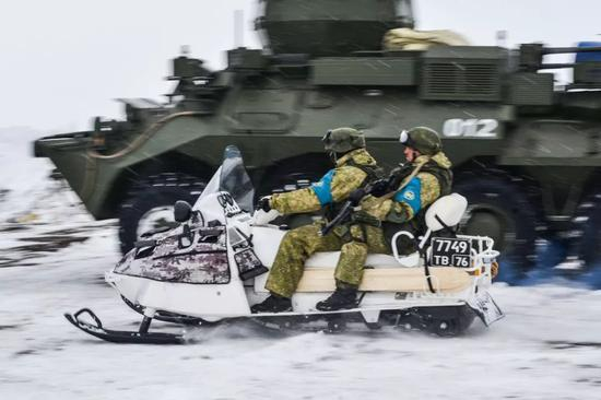 参加演习的雪地摩托和装甲车辆。