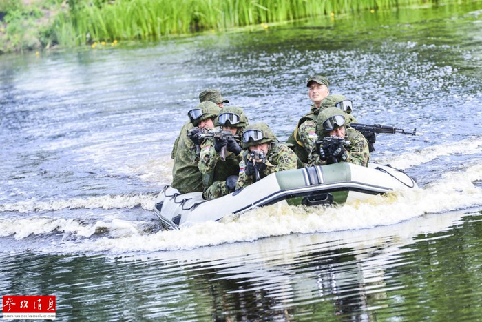 另据白俄罗斯军队媒体报道,此次演习最大的亮点是三国空降兵和特种兵部队将在白俄罗斯境内的陌生地理环境的野外训练场进行多种科目的战斗训练和预设复杂战场条件下的多国联合部队实战反恐演习。图为参演部队正在进行强渡江河训练。