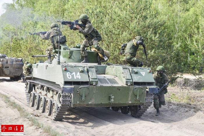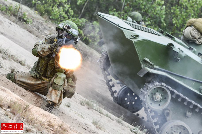 领导部队参加演习的塞尔维亚和白俄罗斯指挥官表示,此次参加演习的都是三国的精锐部队,而在演习过程中各国参演部队也表现出了较强的战斗力和专业素养。图为俄军BMD-2空降战车与协同演练的俄军空降兵。