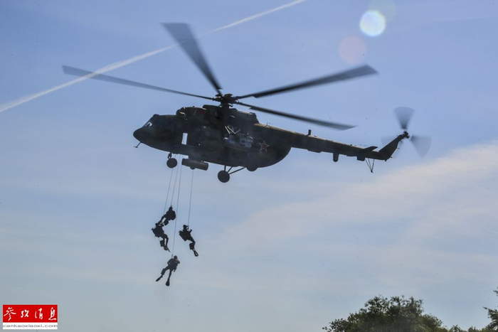 根据俄罗斯国防部官网发布的消息,此次演习在6月6日至6月14日举行,预计将进行三国部队的营级空降战术训练以及联合维和、联合反恐任务训练。图为在演习中俄军空降兵正在进行直升机机降训练。