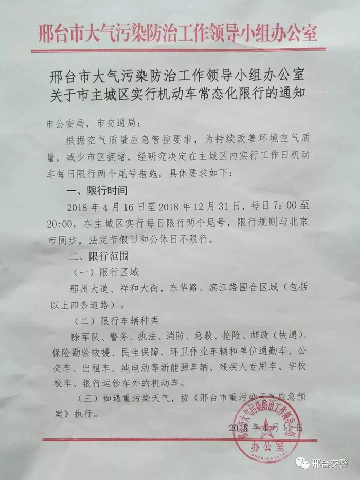 邢台市发布最新通知,将于4月16日(下周一)开启常态化限行!4月16日至12月31日,在主城区实行每日限行两个尾号,限行规则与北京市同步。至此,河北已有5市采取限号措施,包括廊坊、保定、邯郸、邢台、唐山。详细了解↓↓