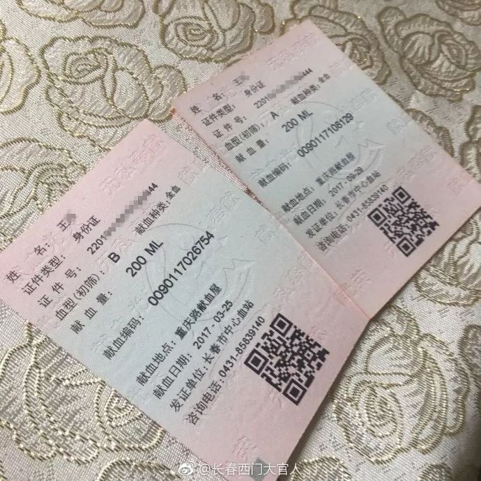 4月7日9时17分,长春本地知名博主@长春西门大官人发布微博,“网友爆料:去年在重庆路献了2次血,今天发现献血证上2次血型显示不一样。”随同微博,还有两张照片,其中一张,为两份献血证,上边的人名和身份证号一致,但是血型却不同,2017年3月的献血证为B型,2017年9月的献血证为A型,献血地点,均是重庆路献血屋。微博发布后,很多是网友关注并评论。